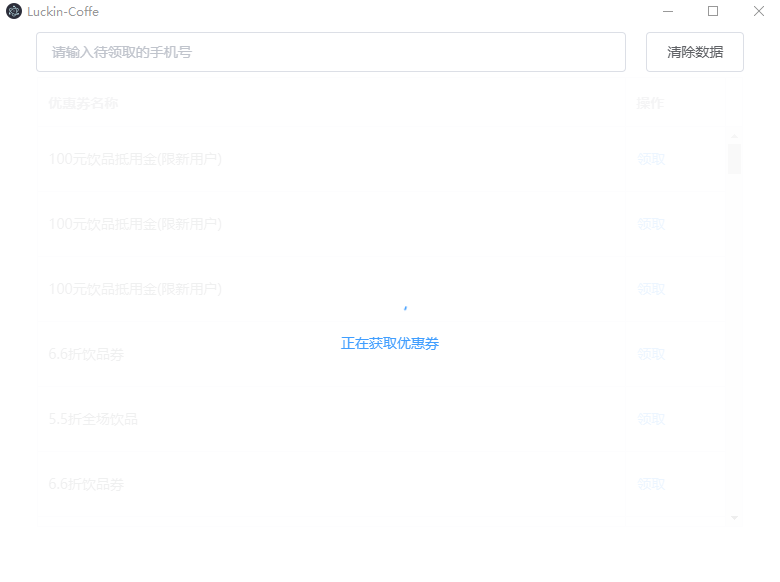 ->打开 luckin-coffee.exe 等待获取优惠券->输入手机号->领取->打开APP/小程序使用