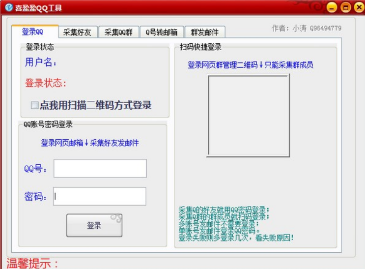 喜盈盈QQ工具是一款极为专业的QQ群提取工具软件,旨在为营销人员提供便捷的服务。它能够一键采集好友列表及其昵称和QQ号,通过扫码方式登录QQ群,轻松管理并提取QQ群列表及QQ账号,是一款颇具实用价值的QQ营销利器,诚邀需要的用户前来下载体验!