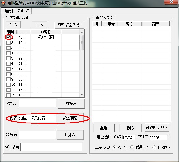 2、切换至功能2,获取好友列表后,您可以进行QQ聊天,并查询身边的朋友。