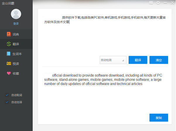 在金山词霸中进行翻译时,若需翻译单词,可以选择【词典】,输入待翻译内容后点击查找即可;若需翻译句子,则选择【翻译】,输入句子后点击【翻译】,便可获取句子的翻译。