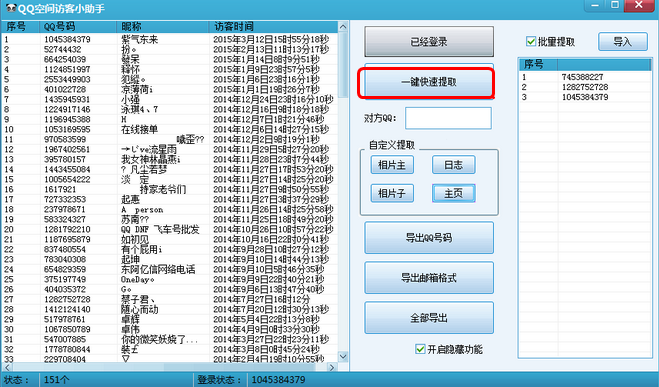 叮咚QQ空间访客小助手是一款绿色轻巧的QQ空间访客提取工具,能够帮助您迅速一键提取所有QQ空间的访客信息,并支持批量导出,绝对是每位用户不可或缺的小工具。有需求的朋友请尽快下载这款叮咚QQ空间访客小助手吧!