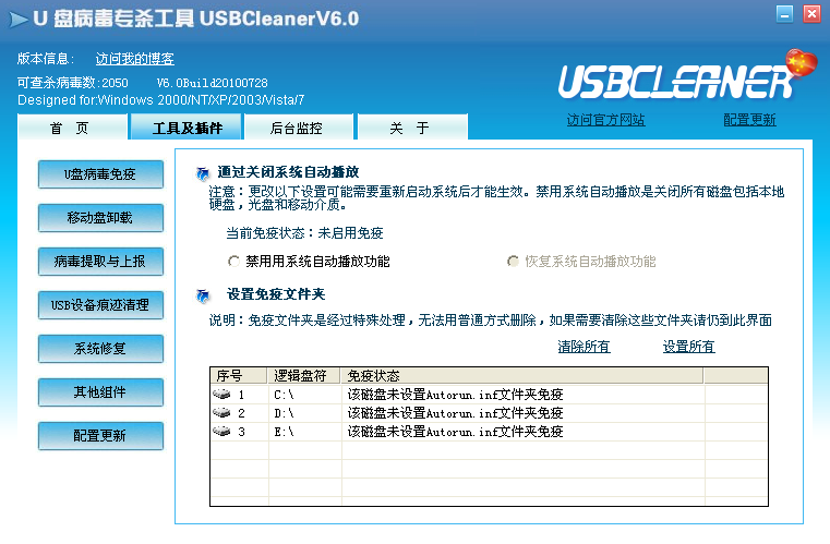 3. 提供广谱的U盘病毒扫描、免疫、修复隐藏及系统文件,并安全卸载移动设备等多项功能,全面保障U盘的安全。