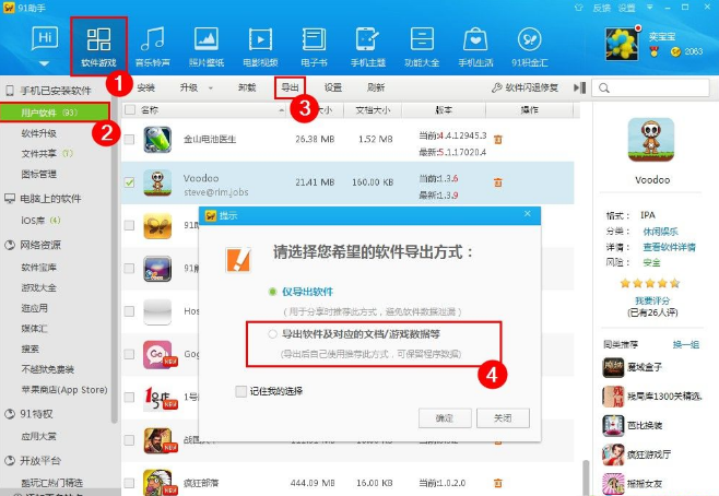 5、对于iOS用户,选择软件游戏——用户软件——导出,选择导出方式,并点击确定进行备份。