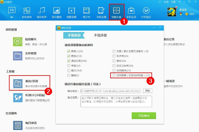 在功能大全中选择备份与还原,找到需备份的数据,点击开始备份。
