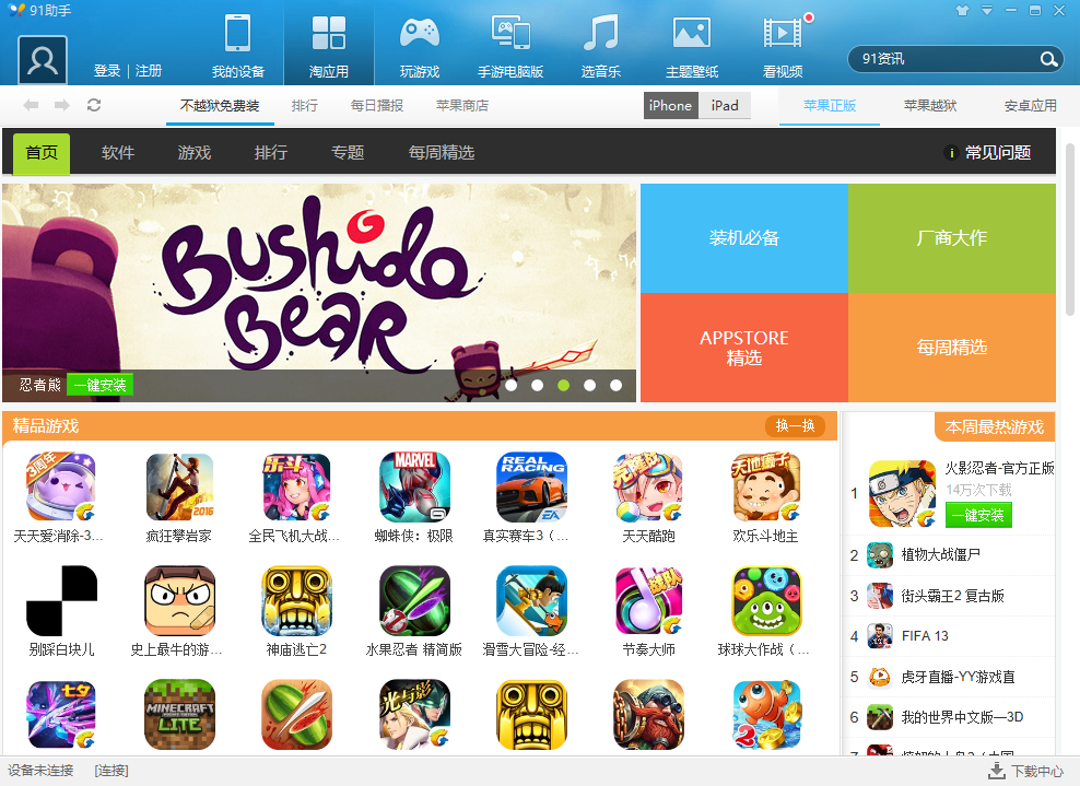 使用数据线将iPad、iPhone等设备连接至电脑,随后打开91手机助手。