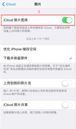 在移动设备上访问“设置 -> iCloud -> 照片”,检查“iCloud照片图库”后面的开关是否开启,如果已开启,请将其关闭。