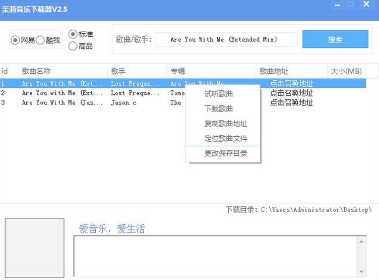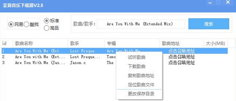 3、点击搜索,右键选择欲下载的歌曲,并复制下载链接