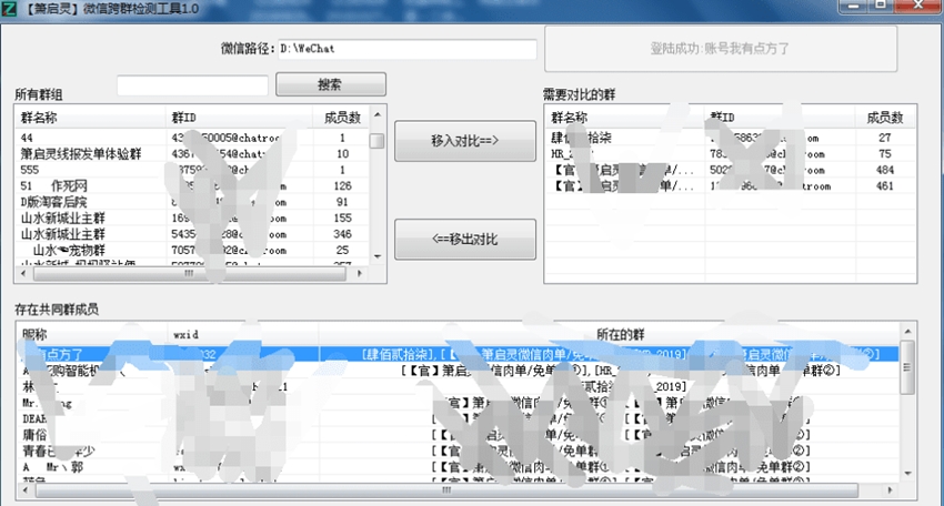 登录微信后,能够对比微信群的群成员,精准查找哪些成员存在重复。