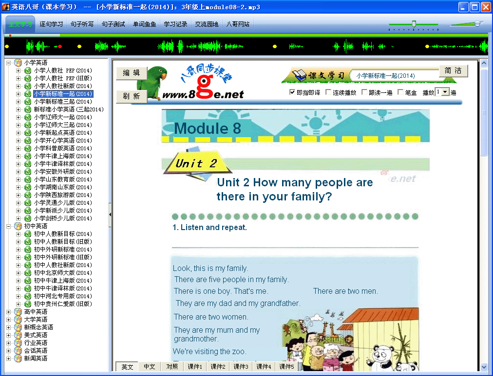 教程丰富:包含最全面的动画英语课程——动画学字母、音标、语法、单词、拼音、听歌学英语、动画故事、小学英语动画、灵通少儿英语动画、新派少儿英语动画、英语九百句动画。