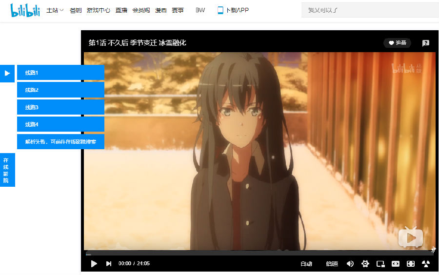 在B站视频播放页面的左侧,会显示蓝色的解析按钮,点击后可展开多条解析线路,任意选择其一(线路1为最佳)即可跳转至新标签页进行观看。