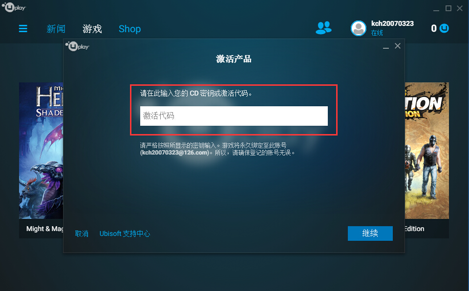 根据上图,弹出激活产品的窗口,将您购买的CDKEY输入后点击【确定】。这样,您购买的产品将会永久绑定在您的UPLAY账号下,如下图所示。