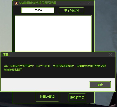 若您怀疑自己的QQ绑定手机号可能已泄漏,QQ绑定手机号泄漏查询器将为您提供查询服务,支持单个QQ号码的查询。若您拥有多个小号,还可进行批量查询。一旦发现泄漏,系统将显示号码的前缀和后缀;若无任何信息显示,则说明安全无虞。随着信息化的迅猛发展,个人信息泄露的风险随之增加,常常会给日常生活带来不便。此款小工具将为您消除不必要的烦恼,希望大家妥善管理个人信息,确保我们的生活安宁无扰。
