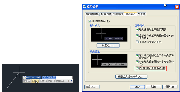 在浩辰CAD的新动态输入中,可以设置“选项匹配时自动执行”。