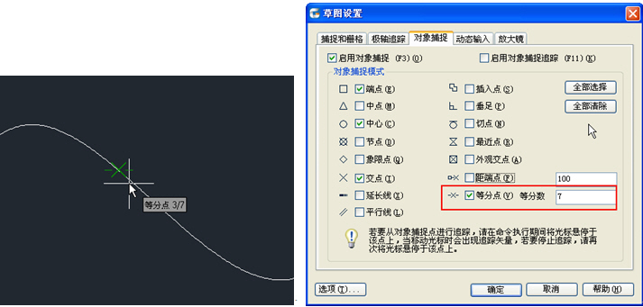 用户可直接捕捉各类线的等分点,支持直线、圆、圆弧、椭圆、椭圆弧、多线、样条曲线和多段线。