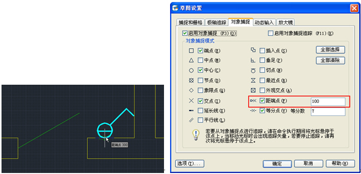 可以捕捉距离端点特定距离的点,距离可自定义设置,支持直线、圆弧、多段线的线段、样条曲线、椭圆弧和多线等各种线形。
