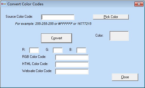 同时,它还具备颜色代码格式(RGB、HTML、Websafe格式)转换器的功能。