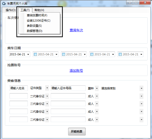 车票无忧3.5个人版是一款可以查询并添加订票车次,同时具备定时抢票功能的软件。电脑版能够自动重试登录,保存多个备用账号,乘客信息可在线存档,支持多窗口协同操作,查询与添加订票车次,定时抢票,循环订票,后台自动识别验证码并进行提示,极大地方便了用户的抢票体验。