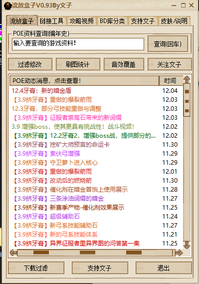 由文子精心制作,其中涵盖了国服网页集市查询插件、补丁工具、过滤工具,以及地雷自动引爆工具,旨在为《流放之路》的玩家提供更为畅快的游戏体验。若您有需求,切勿错过,诚邀下载使用!