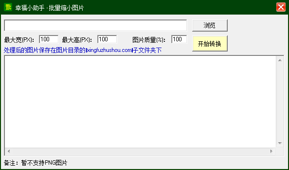 1、点击浏览以选择需缩小的图片;2、设定最大宽度、最大高度及图片质量;3、点击开始转换即可;