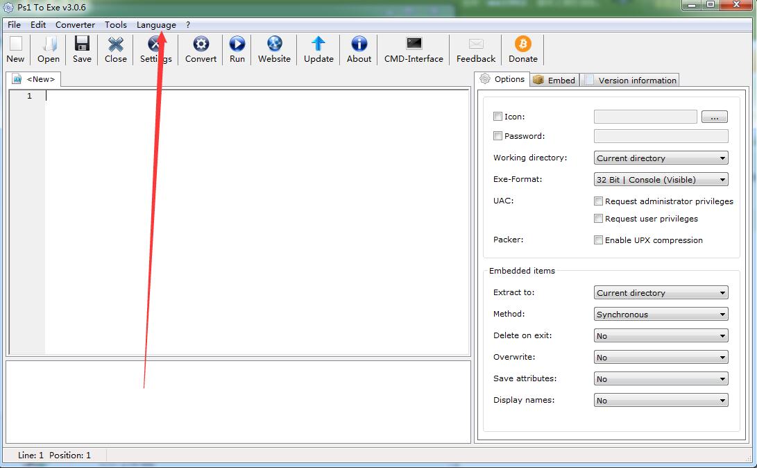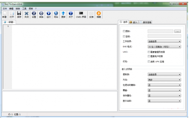 1、运行Ps1 To Exe后,界面左侧为PowerShell代码区域,您可以在此输入代码