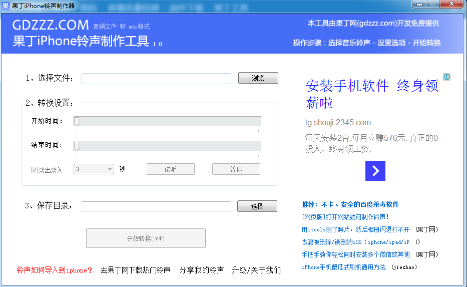 果丁iPhone铃声制作器是一款专为制作iPhone手机铃声格式而设计的工具。与常见的MP3等音频格式不同,iPhone铃声格式独具特色,因此我们亟需一款专门的铃声制作工具。这款铃声制作器操作简便,只需三步便可轻松完成铃声制作,功能强大而实用,快来下载,创造属于你自己的个性化铃声吧!