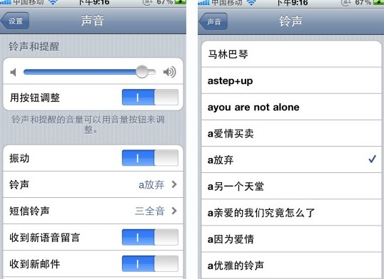 9、待iTunes同步完成后,打开iPhone设置中的铃声,即可看到刚制作的铃声,选择后返回即可替换为最新铃声,如下图所示: