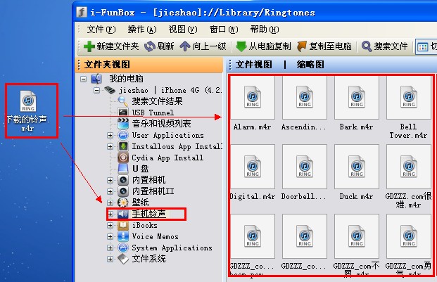3、将您在本站下载的铃声拖动至左侧的“手机铃声”栏目,随后进入手机设置-声音-铃声,便可找到您的铃声。如图所示: