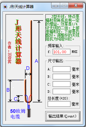 J型天线计算器,一款专业的J型天线计算工具。用户只需输入所需频率,即可轻松计算出J型天线的各项参数,操作简便,极大地减轻了计算的负担,实乃一款极为实用的工具!