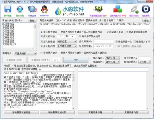 关键词插入时,智能规避网页标签和英文单词的割断;内置的打乱器能够保持原有的空行、标点符号等不变,仅调整其位置。