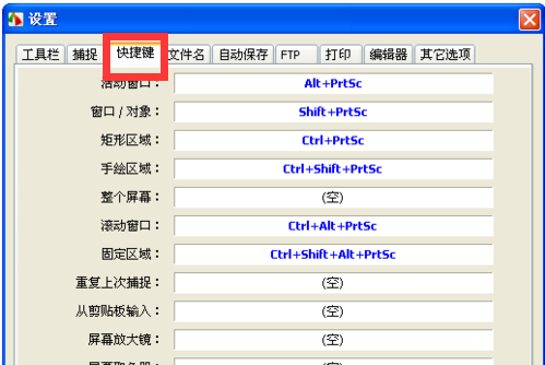 3、在设置界面的第三页【快捷键】中,列出了系统默认的快捷键,用户可根据个人习惯进行修改。