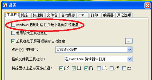 2、在设置界面的第一页【工具栏】选项中,勾选【启动时运行】可节省每次开机后手动打开的步骤。