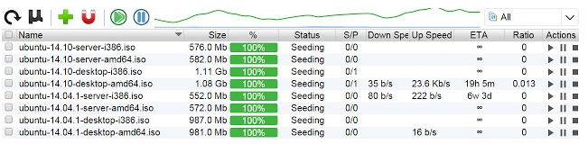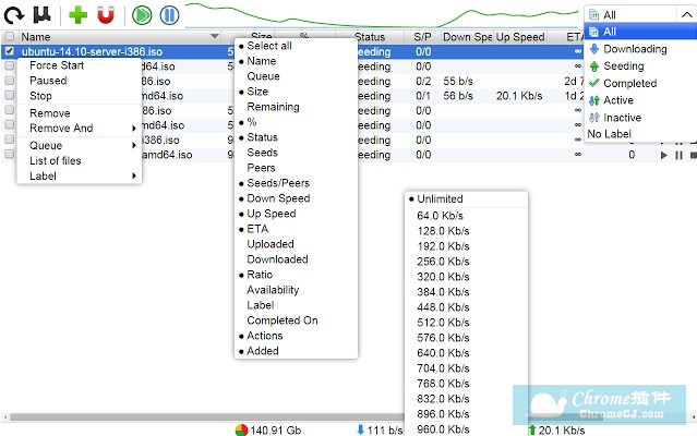 3.在uTorrent easy client下载客户端中,用户可以对正在下载的BT中更多的控制,包括下载的速度限制,需要显示的BT下载的详细信息列表以及通过分类的方式来访问下载列表等,如图所示: