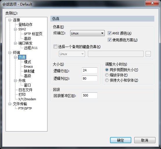 终端选择“Linux”, 勾选“ANSI颜色” 和 “使用颜色方案”,终端颜色配置请见下面后续...