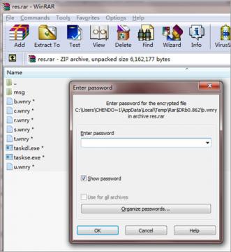 勒索病毒被漏洞远程执行后,会从资源文件夹下释放一个包,此压缩包会在内存中通过密码:WNcry@2ol7解密并释放文件。这些文件包含了后续弹出勒索框的Exe,桌面背景图片的Bmp,包含各国语言的勒索字体,还有辅助攻击的两个Exe文件。这些文件会释放到了本地目录,并设置为隐藏。