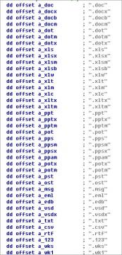 通过分析病毒,可以看到,以下后缀名的文件会被加密: