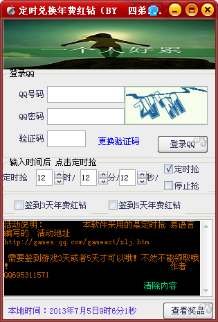 为了帮助q友们奖励,制作了该活动的定时兑换年费红钻工具,界面很简单,登录之后即可操作,采用易语言编写,安全无毒,欢迎下载体验。