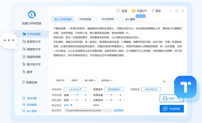 迅捷是一款专业的格式转换工具,它可以将文字转换为语音文件,并且支持MP3、WAM、AMR、WMA等多种格式,软件不仅可以完成文字转语音,还可实现音频、录音文件转文字,用户只需上传需要转换的文件即可一键转换。欢迎下载使用。