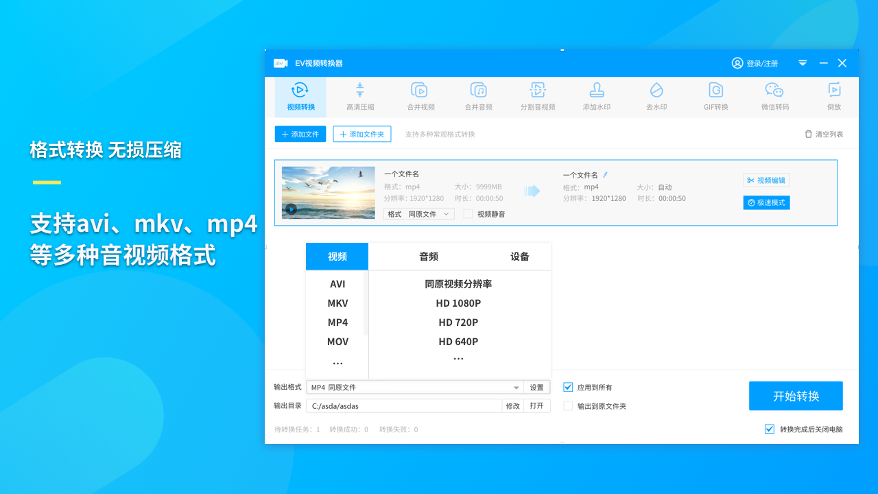 EV是一款界面简洁而功能强大的视频转换软件。它不仅支持格式转换、视频合并、视频分割、添加水印,还能制作GIF,进行高清转换及视频压缩等多种实用功能,诚邀各位下载体验。
