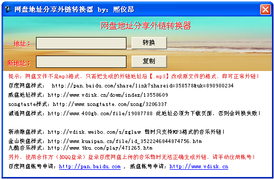 地址分享外链转换器支持多种平台,包括百度网盘、威盘、songtaste、城通网盘、新浪及金山快盘等,是一款功能强大的网盘格式转换工具,特别适合用于设置QQ空间的背景音乐。使用过程简单便捷,只需输入地址,轻点转换即可,转换后的域名将自动缩短,默认采用url.cn域名!