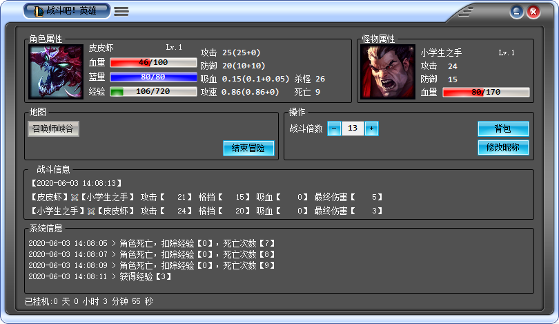 2、每次游戏中会随机生成一个与角色当前等级相匹配的怪物,其攻击与防御能力均依据角色属性生成。