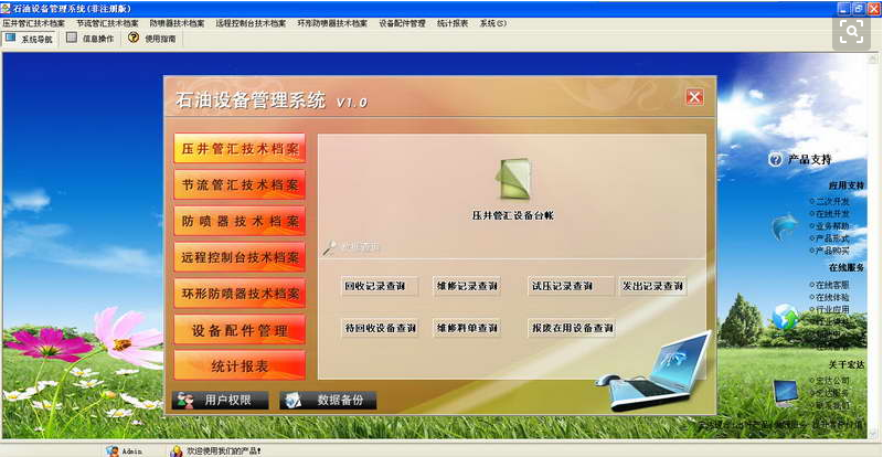 4、台技术档案:涵盖压井管汇设备台帐、发出记录、回收记录、维修记录、维修料单及设备调试,所有操作步骤均可进行详细查询、统计及报表打印输出。