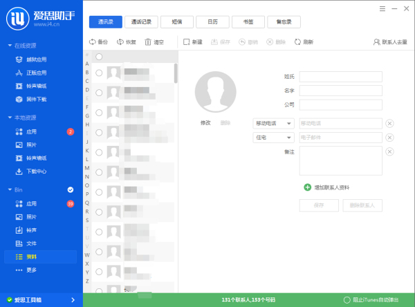 提供通讯录管理,备份通讯到本地,换机或刷机亦不必担心通讯录丢失。同时可一键合并重复联系人,并管理通话记录、日历、书签、备忘录等内容。