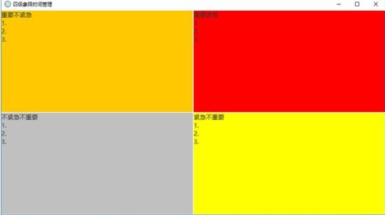 四级象限时间管理工具通过不同的颜色标识,清晰展示各种事务的紧急程度,便于用户一目了然地进行管理。用户可以在每个象限中记录所需事务,右键点击最小化托盘可选择退出!