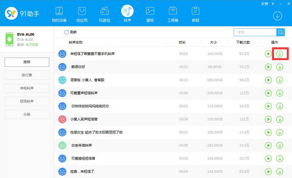 第一步:打开91助手PC端,将移动设备连接至电脑,选择“铃声”模块,点击铃声列表右侧的“下载”按钮,将所选铃声下载并导入到移动设备中。