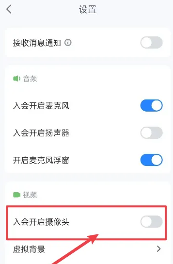 3、在设置界面找到【入会开启摄像头】,关闭按钮
