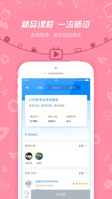 提供免费公开课与多样精品课程,涵盖考试、教师资格证考试(幼儿、小学、初中、高中)笔试各科目,结构化面试、说课、试讲、答辩等全流程指导。