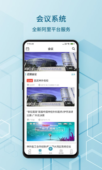会议系统:涵盖神经外科全行业的培训班、峰会等各类会议信息,提供会议预告、报名、查询、直播、报导等服务,通过移动互联网便捷地让神外医生了解并参与行业会议,观看会议视频。