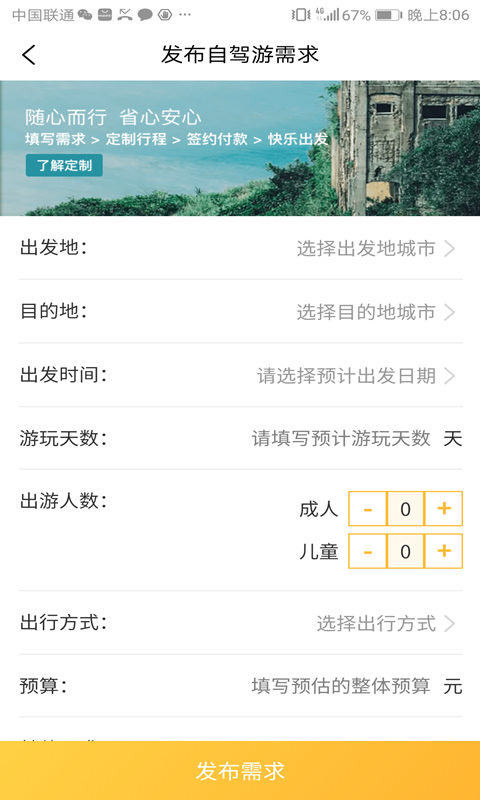 需求发布:平台提供定制化服务,用户可提出自己的旅行需求,由平台为其量身打造专属的旅行方案,轻松解决用户在旅行中想玩却不知如何下手的困扰。