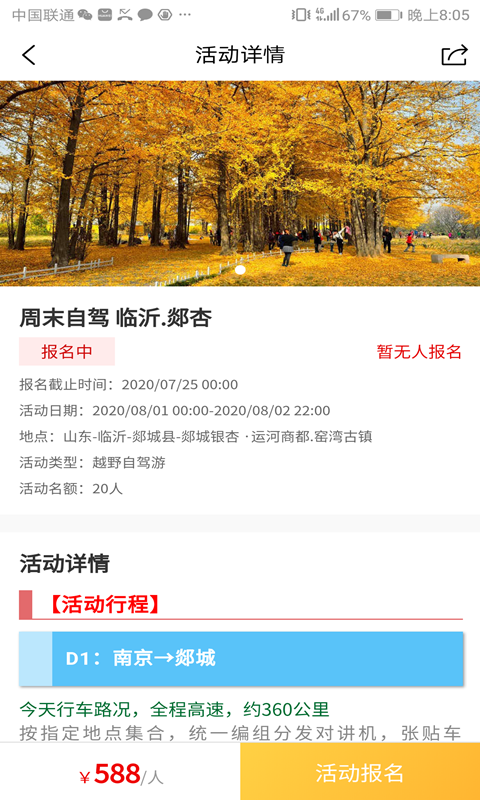 活动报名:平台定期发布趣味十足的自驾旅游方案或汽车活动,为用户提供更具特色与多样化的旅游体验,彻底告别以往枯燥乏味、走马观花的传统旅行方式。