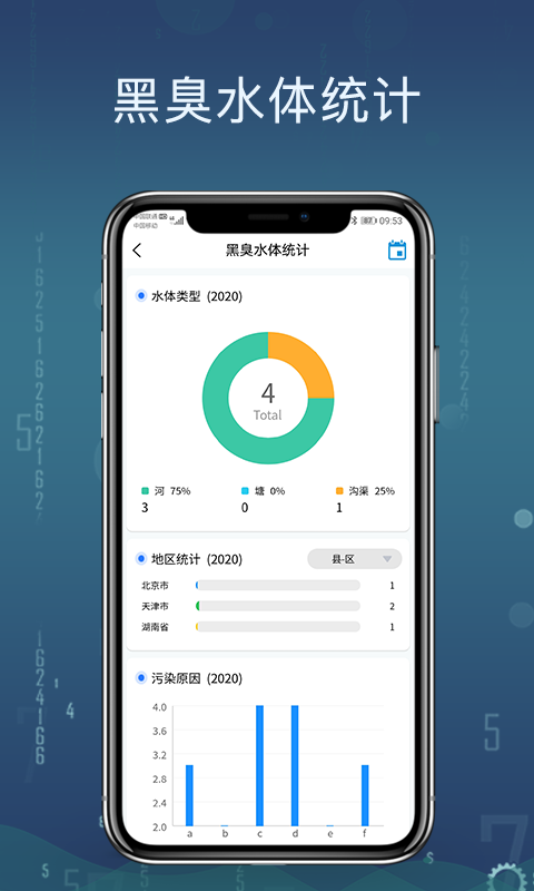 数据自动统计,图形展示各地黑臭水污染问题的占比及治理进度;